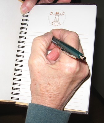 For the interior of the journal, I chose a notepad from a pharmaceutical company that had Leonardo da Vinci’s Vitruvian Man at the top. She was able to slice off the advertising from the bottom, leaving me with lined pages decorated with a pen and ink sketch of the proper proportions of a naked man at the top of each one. Surely my notes in this journal will be particularly profound.
