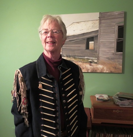So the jacket’s original style is a combination of American Indian and military influence, which appeals to me as symbolic of this prairie where I live: occupied by Indians who were chased off by the military, and then adopted by people like me who don’t fit willingly into a particular mold.