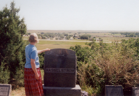 Linda at the Hasselstrom plot in the Highland Park Cemetery, looking east towards Hermosa.