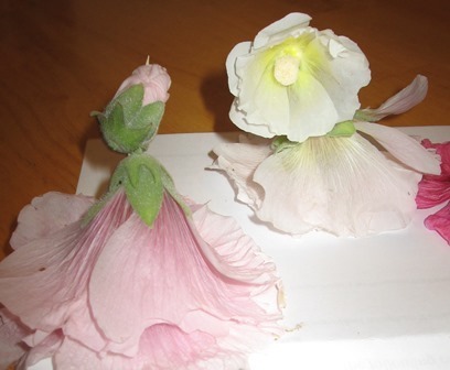 I always thought these basic hollyhock dolls looked as though they had no heads. To remedy that, take a green seed pod or bud and fasten it with a toothpick above the skirt blossom.